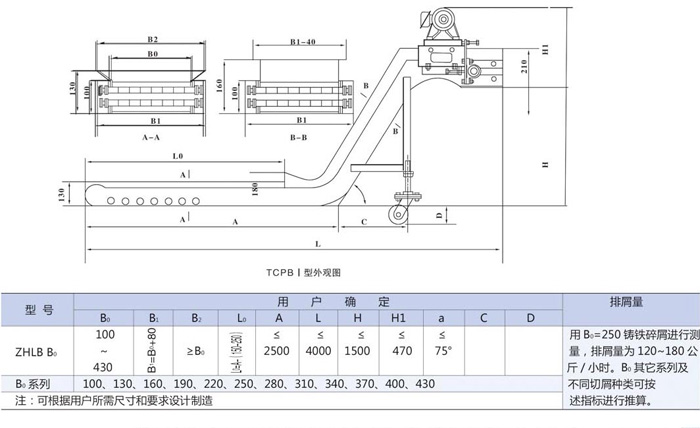 1、根據(jù)安裝空間的大小確定排屑機的寬度B1,高度需大于130mm