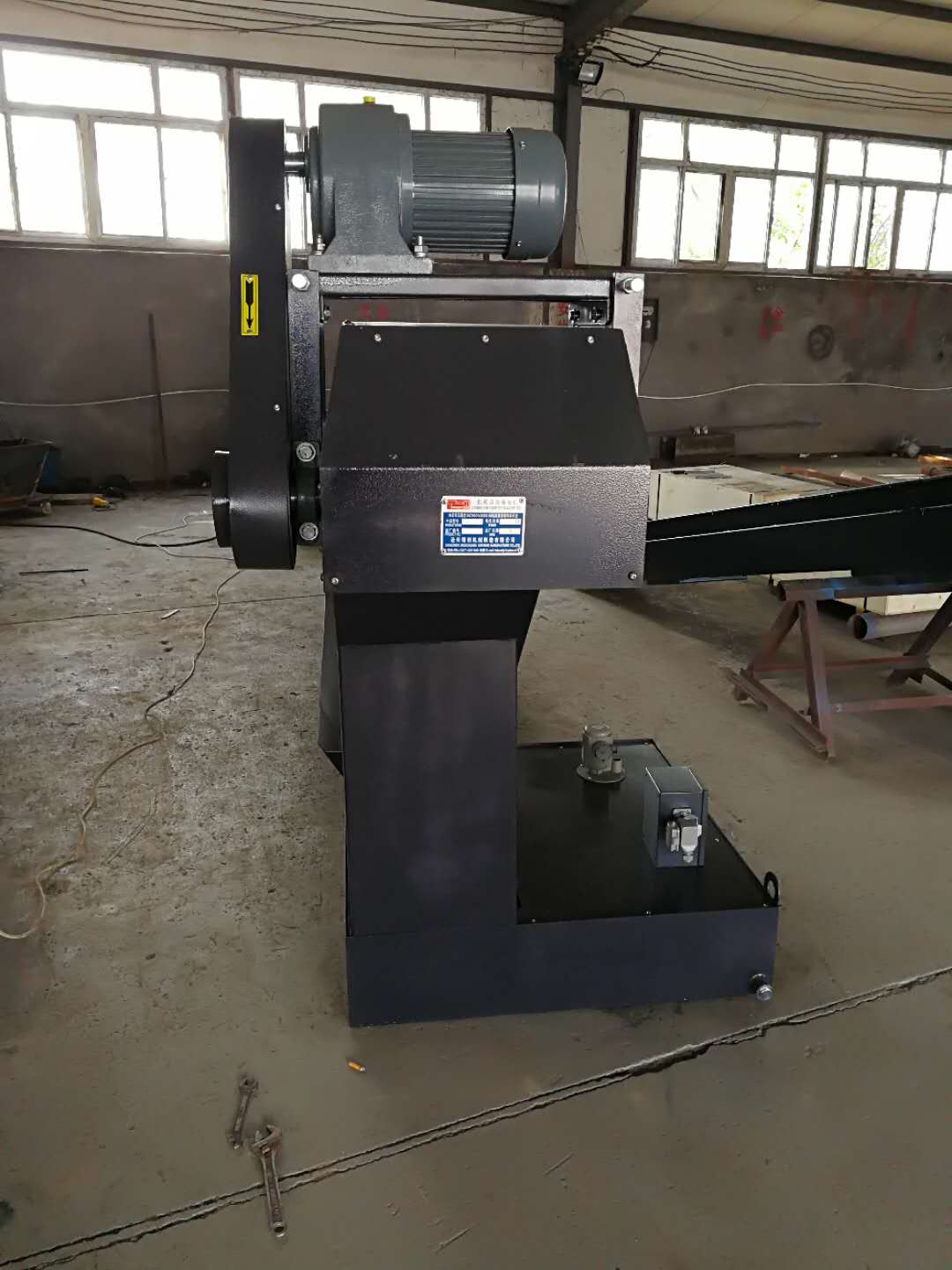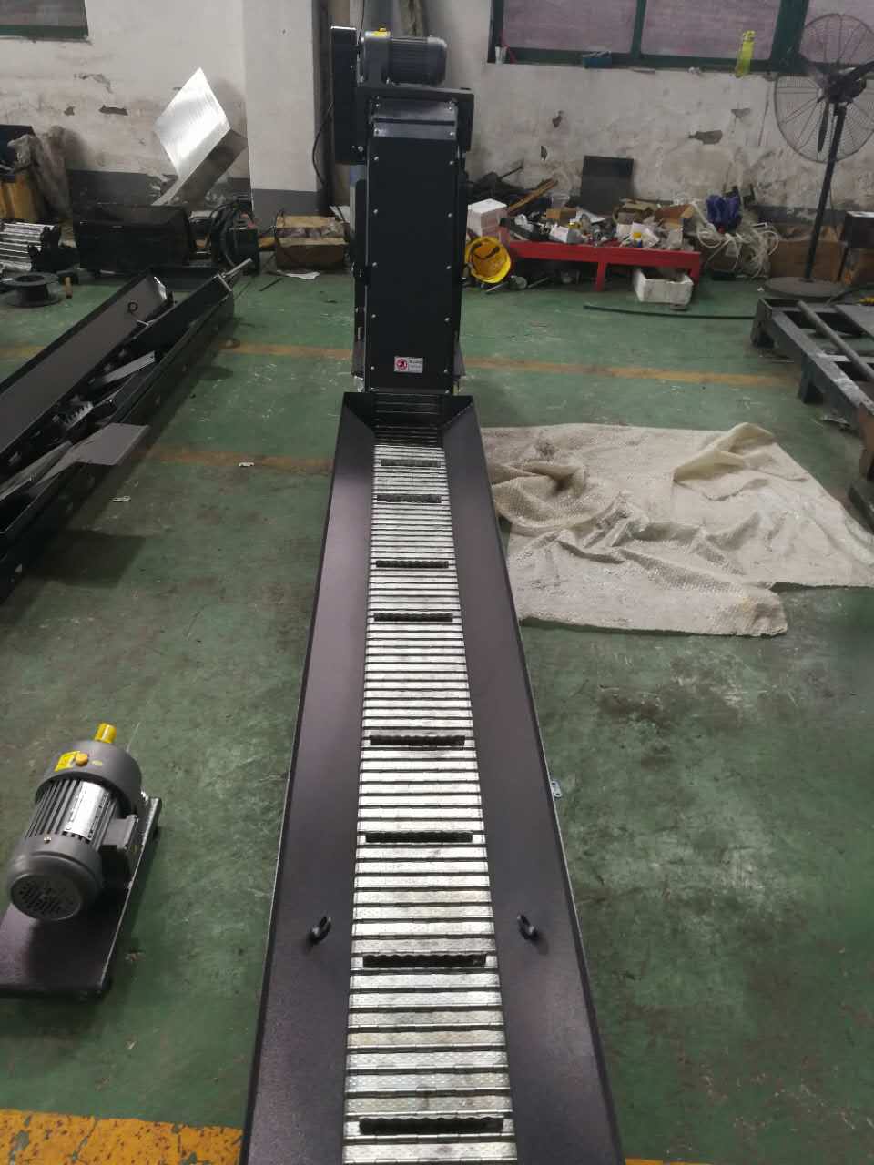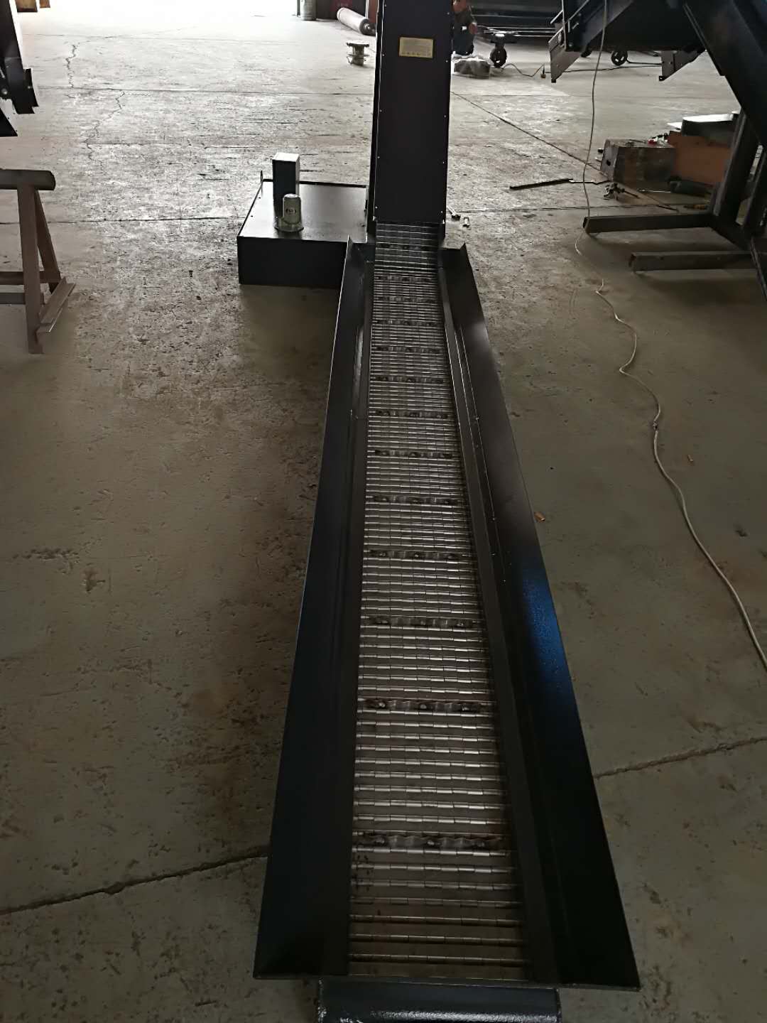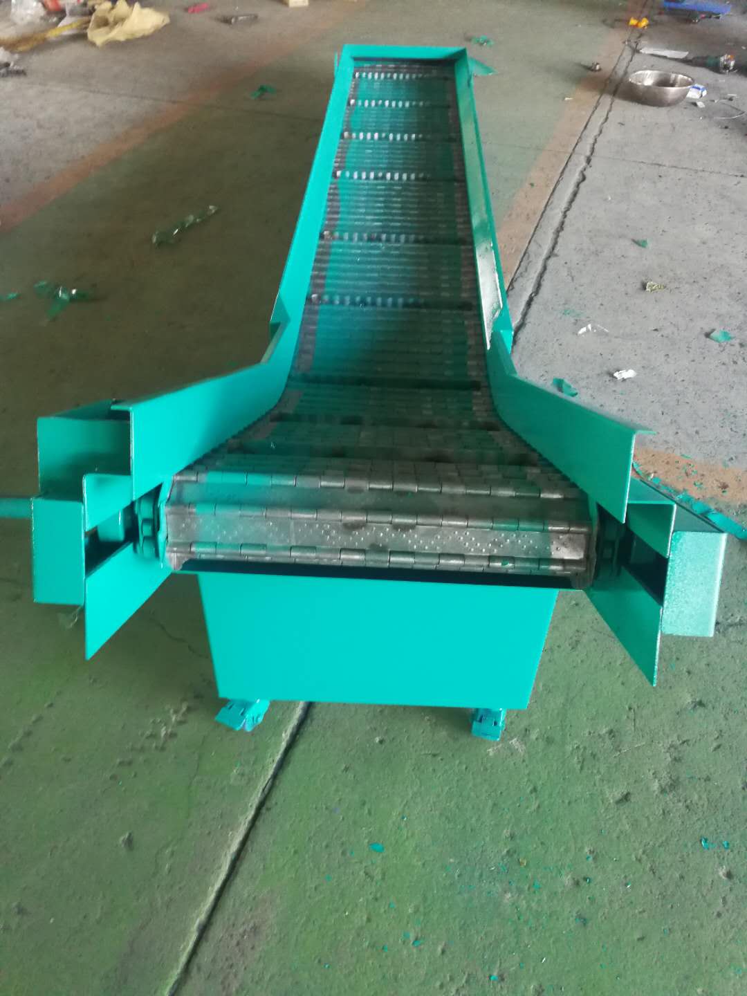 4、我公司生產的鏈板排屑機廣泛應用于車床、鉆床、龍門銑床、鏜床、加工中心及其他專用機床,操作簡單、運行可靠、拆裝方便、維修容易。亦可與其它排屑裝置聯(lián)合使用,形成各種形式排列的切削處理系統(tǒng)。排屑長度可達40米。