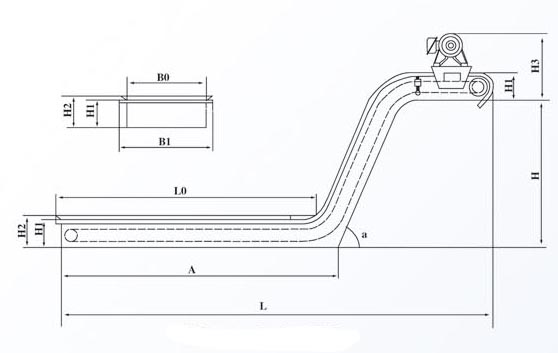 1、根據(jù)安裝空間的大小確定磁性排屑機(jī)的高度H2(≥140mm),長(zhǎng)度L0,